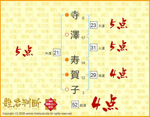 寺(6画)澤(17画) 寿(14画)賀(12画)子(3画)