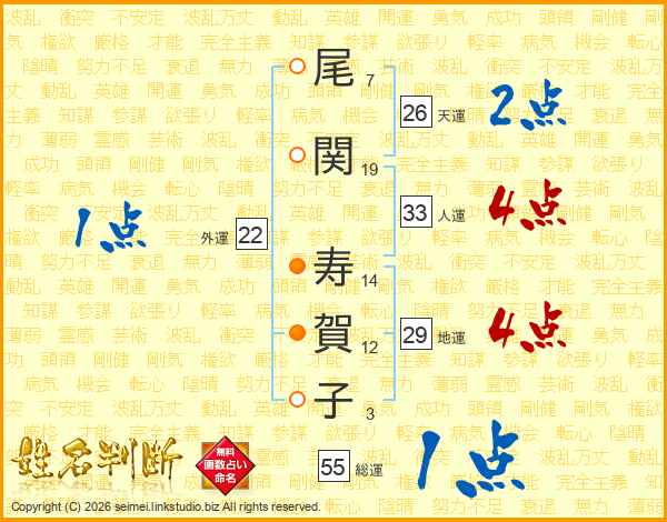 尾(7画)関(19画) 寿(14画)賀(12画)子(3画)