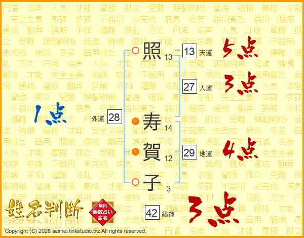 あなたの人生を表す1番重要な運勢です。生涯を通じて影響する総合運となり、主に50歳以降の晩年期に影響を及ぼします。苗字と名前の合計画数。