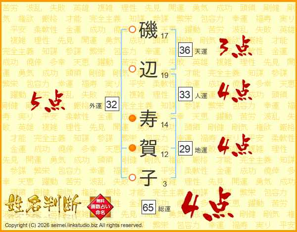磯(17画)辺(19画) 寿(14画)賀(12画)子(3画)