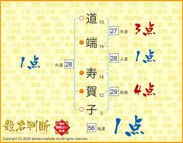 道(13画)端(14画) 寿(14画)賀(12画)子(3画)
