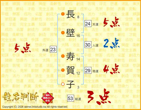 長(8画)壁(16画) 寿(14画)賀(12画)子(3画)
