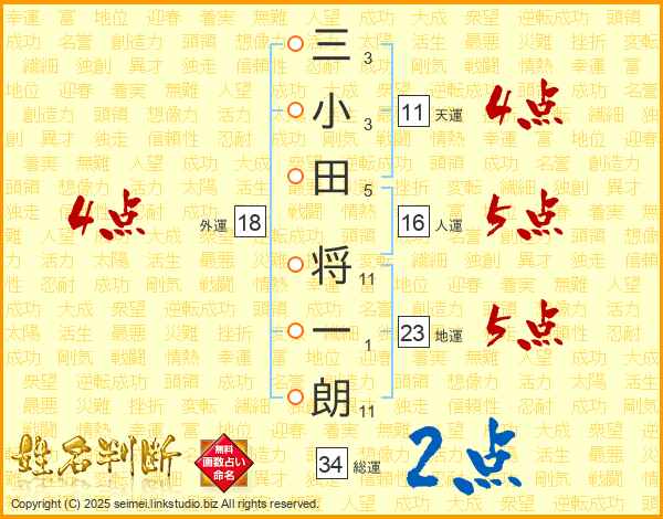 三(3画)小(3画)田(5画) 将(11画)一(1画)朗(11画)