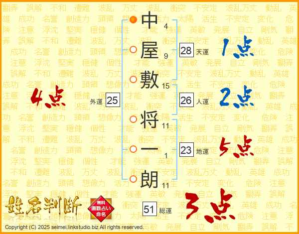 中(4画)屋(9画)敷(15画) 将(11画)一(1画)朗(11画)
