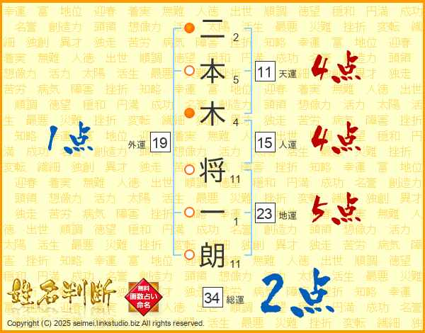 二(2画)本(5画)木(4画) 将(11画)一(1画)朗(11画)