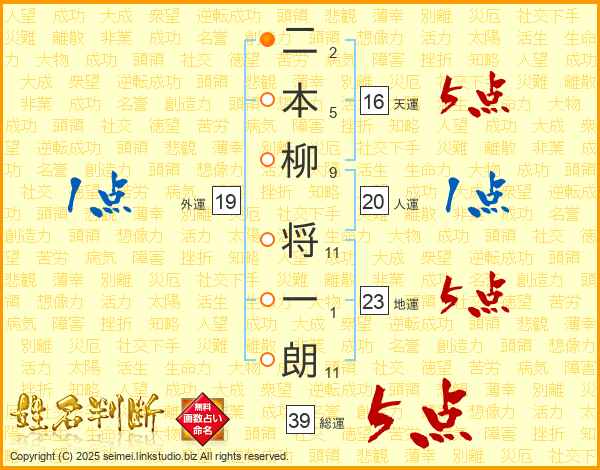 二本柳将一朗さんの総運は39画の5点!