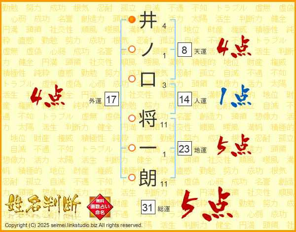 井(4画)ノ(1画)口(3画) 将(11画)一(1画)朗(11画)