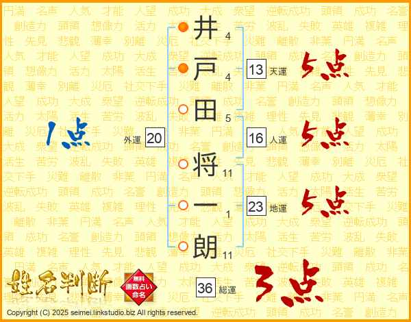 井(4画)戸(4画)田(5画) 将(11画)一(1画)朗(11画)