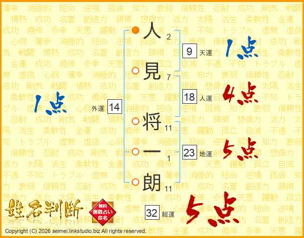 人(2画)見(7画) 将(11画)一(1画)朗(11画)