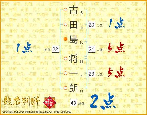 古(5画)田(5画)島(10画) 将(11画)一(1画)朗(11画)