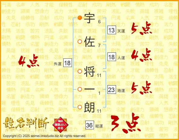 宇(6画)佐(7画) 将(11画)一(1画)朗(11画)