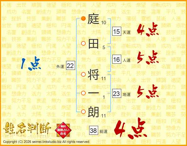 庭(10画)田(5画) 将(11画)一(1画)朗(11画)