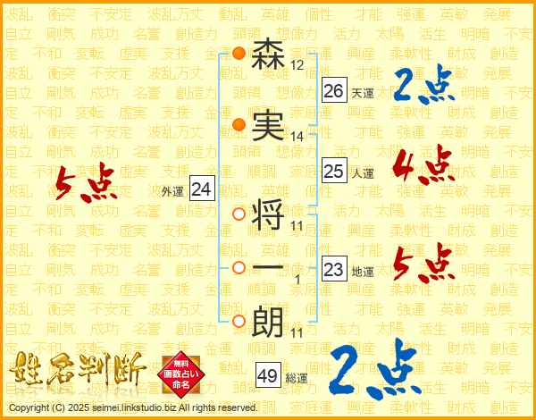 森(12画)実(14画) 将(11画)一(1画)朗(11画)