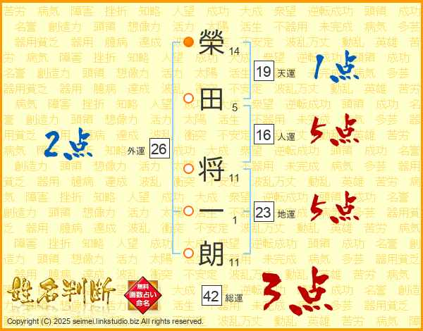 榮(14画)田(5画) 将(11画)一(1画)朗(11画)