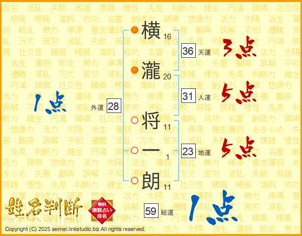 横(16画)瀧(20画) 将(11画)一(1画)朗(11画)