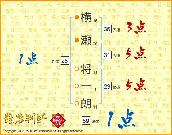 横(16画)瀬(20画) 将(11画)一(1画)朗(11画)