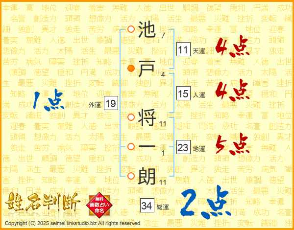 池(7画)戸(4画) 将(11画)一(1画)朗(11画)