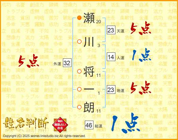 瀬(20画)川(3画) 将(11画)一(1画)朗(11画)