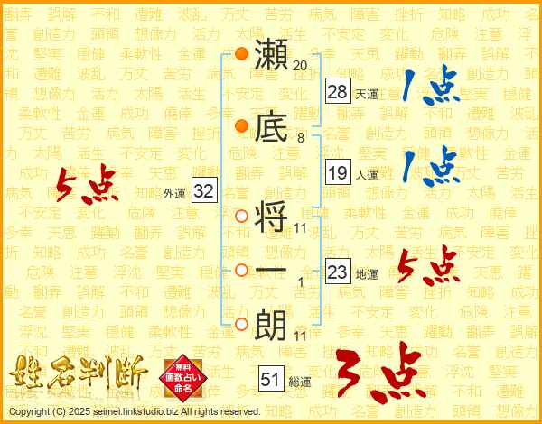 瀬(20画)底(8画) 将(11画)一(1画)朗(11画)