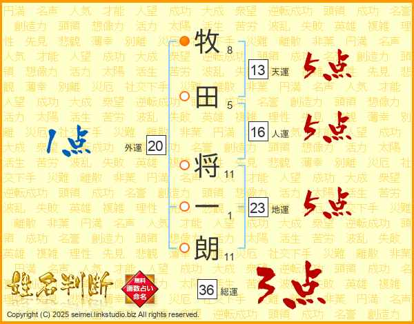 牧(8画)田(5画) 将(11画)一(1画)朗(11画)