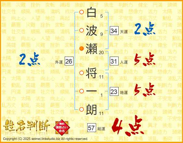 白(5画)波(9画)瀬(20画) 将(11画)一(1画)朗(11画)