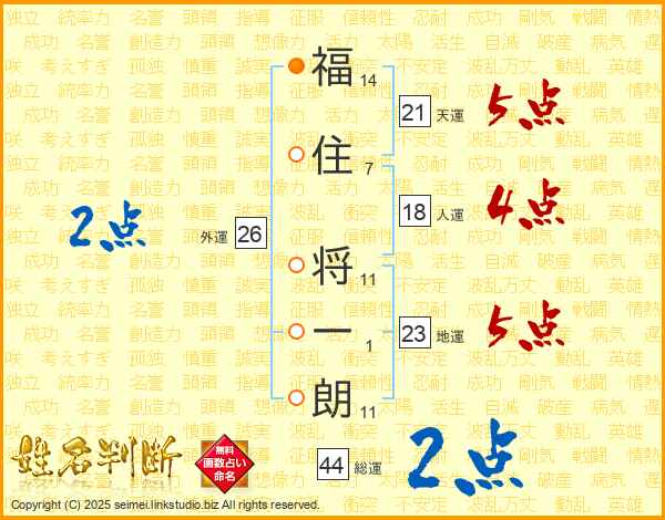 福(14画)住(7画) 将(11画)一(1画)朗(11画)