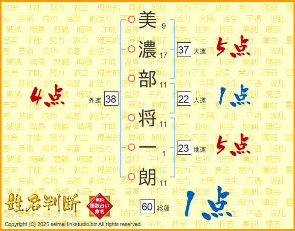 美(9画)濃(17画)部(11画) 将(11画)一(1画)朗(11画)