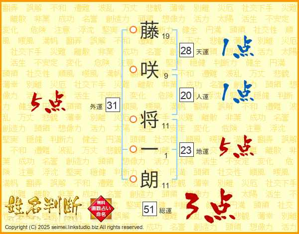 藤(19画)咲(9画) 将(11画)一(1画)朗(11画)