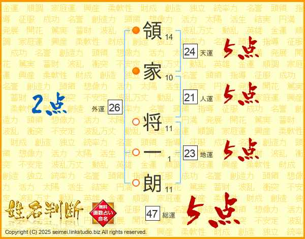 領(14画)家(10画) 将(11画)一(1画)朗(11画)