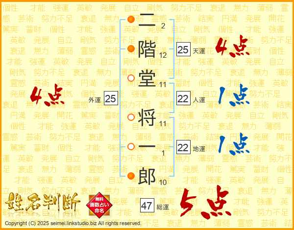 二(2画)階(12画)堂(11画) 将(11画)一(1画)郎(10画)