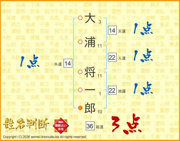 大(3画)浦(11画) 将(11画)一(1画)郎(10画)
