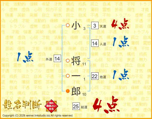 生活面を象徴する運勢です。外部から受ける影響力を表し、結婚運、家庭運や職場、環境への順応性を表します。総運から人運を引いた画数。姓や名が1文字の場合を除く。
