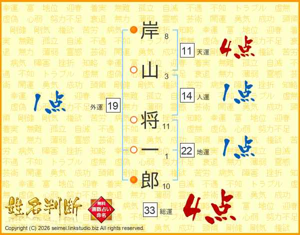岸(8画)山(3画) 将(11画)一(1画)郎(10画)