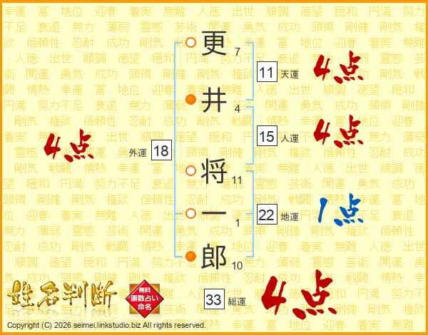 更(7画)井(4画) 将(11画)一(1画)郎(10画)