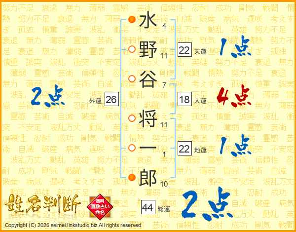 水(4画)野(11画)谷(7画) 将(11画)一(1画)郎(10画)