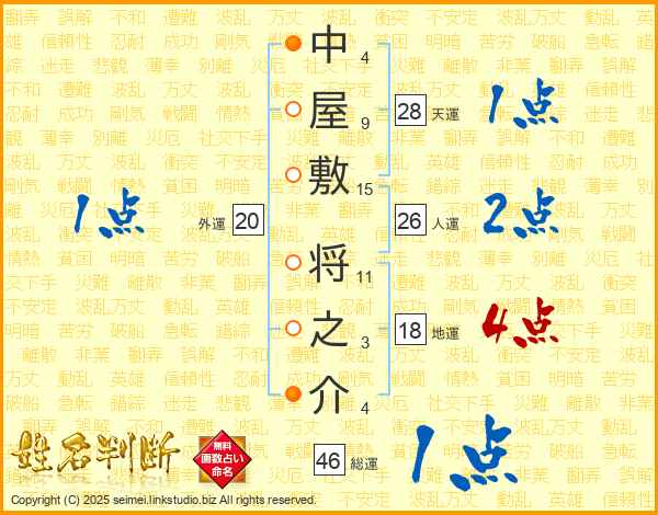 中屋敷将之介さんの総運は46画の1点!
