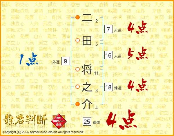 あなたの人生を表す1番重要な運勢です。生涯を通じて影響する総合運となり、主に50歳以降の晩年期に影響を及ぼします。苗字と名前の合計画数。