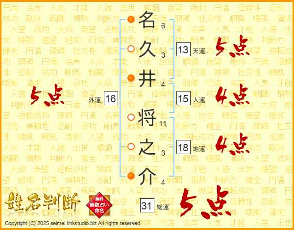 名(6画)久(3画)井(4画) 将(11画)之(3画)介(4画)