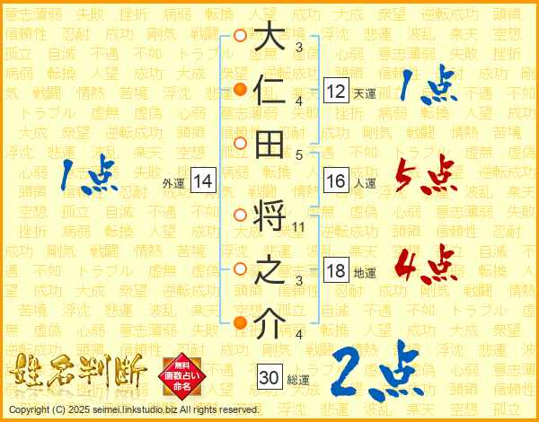 大(3画)仁(4画)田(5画) 将(11画)之(3画)介(4画)
