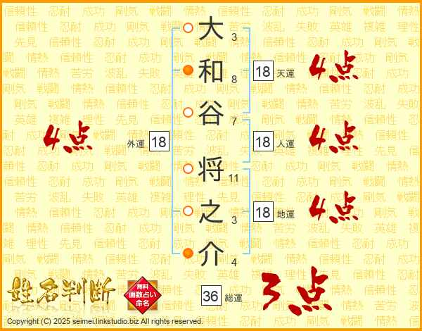 あなたの人生を表す1番重要な運勢です。生涯を通じて影響する総合運となり、主に50歳以降の晩年期に影響を及ぼします。苗字と名前の合計画数。
