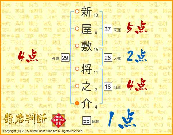 新(13画)屋(9画)敷(15画) 将(11画)之(3画)介(4画)