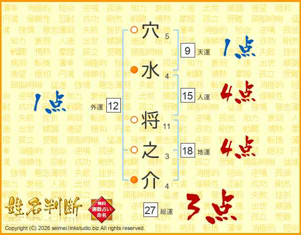 穴(5画)水(4画) 将(11画)之(3画)介(4画)