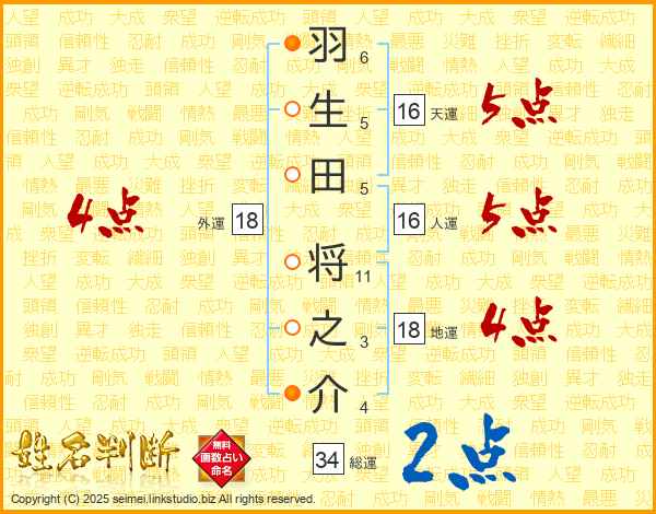 羽(6画)生(5画)田(5画) 将(11画)之(3画)介(4画)