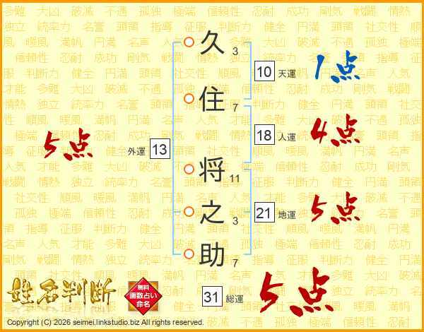 久(3画)住(7画) 将(11画)之(3画)助(7画)