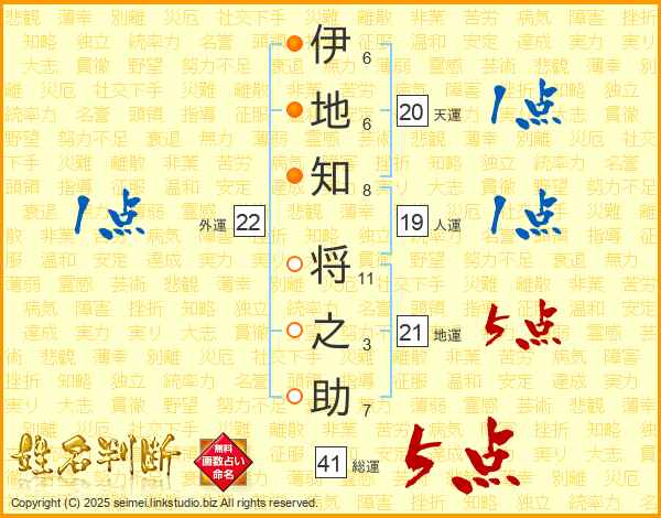 伊(6画)地(6画)知(8画) 将(11画)之(3画)助(7画)