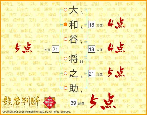 大和谷将之助さんの総運は39画の5点!
