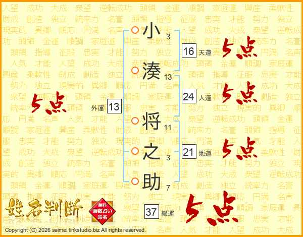 小(3画)湊(13画) 将(11画)之(3画)助(7画)