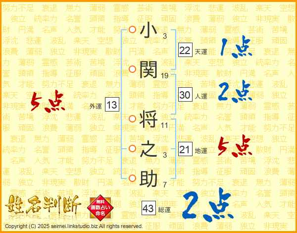 小(3画)関(19画) 将(11画)之(3画)助(7画)