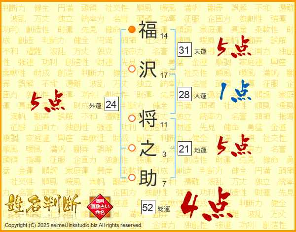 福(14画)沢(17画) 将(11画)之(3画)助(7画)