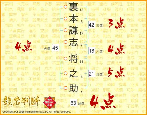 裏(13画)本(5画)謙(17画)志(7画) 将(11画)之(3画)助(7画)